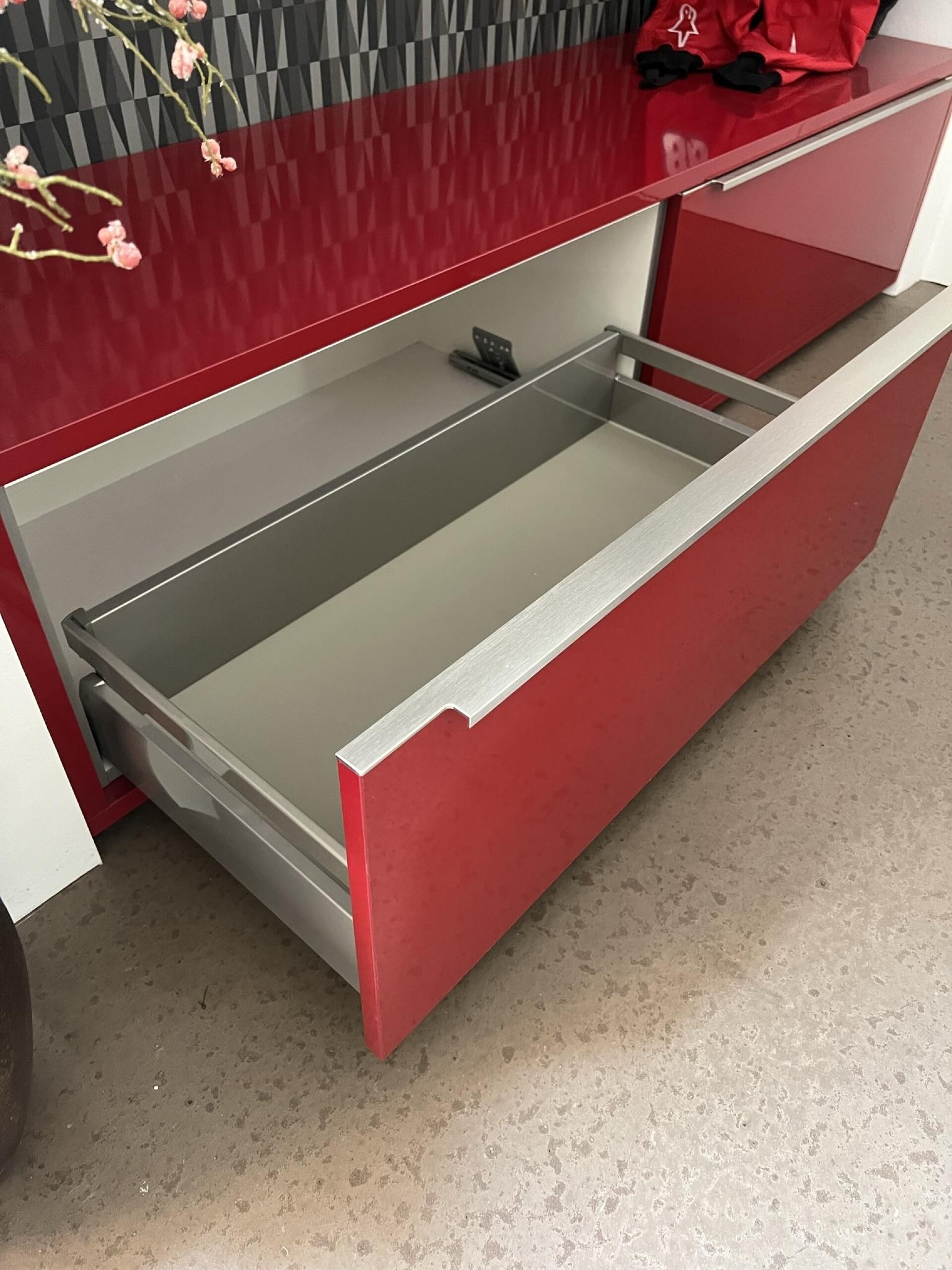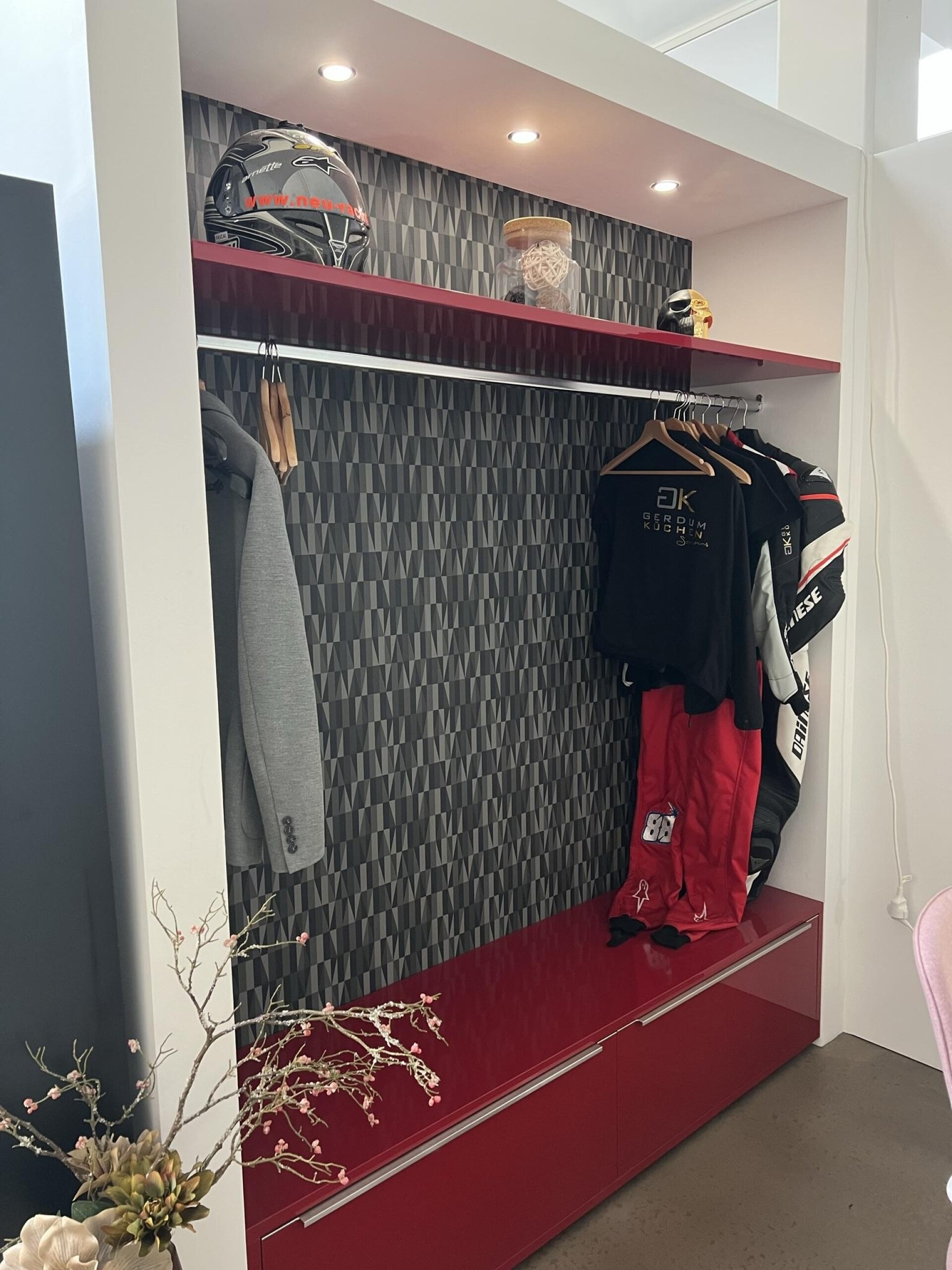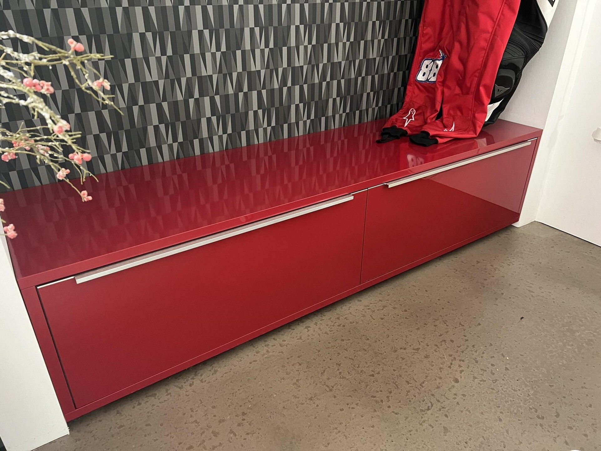 Küchenmöbel lackiert in Rot-Hochglanz inklusive Auszüge - perfekt für Ihre Garderobe!